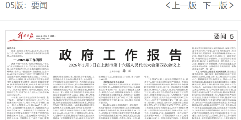 2025年是“十四五”规划冲刺收官、“十五五”规划谋篇布局之年。习近平总书记再次亲临上海考察指导工作,对上海发展作出新的战略擘画,全市上下倍受鼓舞、倍感振奋。过去一年,我们坚持以习近平新时代中国特色社会主义思想为指导,全面贯彻落实党的二十大和二十届历次全会精神,深入贯彻落实习近平总书记考察上海重要讲话精神,坚决贯彻落实党中央、国务院的决策部署,在中共上海市委坚强领导下,着力推动高质量发展,加快建设“五个中心”,统筹抓好稳增长、促转型、惠民生、防风险各项工作,完成了市十六届人大三次会议确定的目标任务。