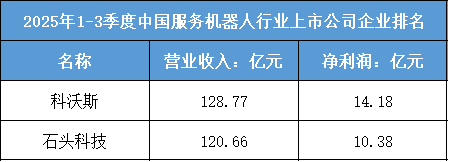 2025年1-3季度中国服务机器人行业上市公司的业绩排名,虽仅呈现两家企业的数据,却清晰勾勒出行业“双寡头领跑、市场集中度极高”的格局,同时也折射出服务机器人赛道的高盈利特性与发展潜力。