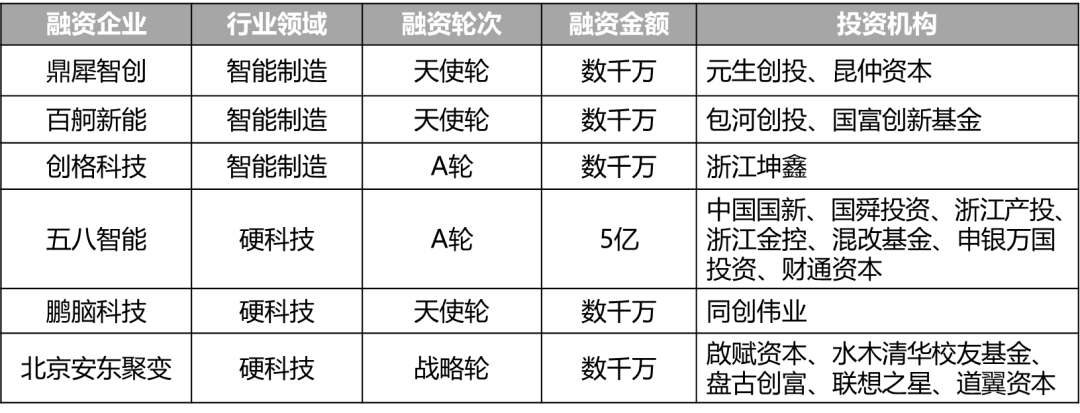 1.AI驱动新材料设计与智能研发商鼎犀智创完成CNY数千万天使轮融资项目简介:鼎犀智创是一家AI驱动新材料设计与智能研发商,基于自研材料大模型智能体驱动的RhinoWise™,专注化学领域的数据及上下文的理解能力和预测能力,并通过GenAI驱动的RhinoWise™自动化实验平台,全方位自主完成材料从“设计–模拟–制备–表征”全流程,实现科研实验、生产运营等场景的超级自动化。2.绿色船舶动力系统研发商百舸新能完成CNY数千万天使轮融资项目简介:百舸新能是一家绿色船舶动力系统研发商,主要从事绿色船舶与新能源动力系统研发业务,并具备高性能变流器、高可靠性直流组网电力系统及AI智能能量管理等核心技术能力,已构建覆盖组网、推进、保护与岸电接入的完整技术体系。3.汽车电气信号设备装置及关键零部件研发商创格科技完成CNY数千万A轮融资项目简介:创格科技是一家汽车电气信号设备装置及关键零部件研发商,公司深耕于商用车动力系统核心部件的研发、生产和销售,产品主要包括发动机气缸盖、隔热罩、油底壳、线束、飞轮/飞轮壳、进排气系统等商用车关键部件。1.仿生特种机器人研发商五八智能完成CNY5亿A轮融资投资方:中国国新、国舜投资、浙江产投、浙江金控、混改基金、申银万国投资、财通资本项目简介:五八智能是一家仿生特种机器人研发商,布局人形机器人、行业级四足机器人等业务,专注仿生运动控制、仿生智能感知、自然人机交互等关键技术。2.非侵入式脑机接口研发商鹏脑科技完成CNY数千万天使轮融资项目简介:鹏脑科技是一家非侵入式脑机接口研发商,公司聚焦非侵入式脑机接口为核心技术路径—不仅契合大众化“便捷性”需求,更突破传统非侵入式“信号弱、精度低、场景适配难”痛点,推动技术从专业医疗向日常健康场景规模化落地。3.可控核聚变商业化发电技术研发商北京安东聚变完成CNY数千万战略融资投资方:啟赋资本、水木清华校友基金、盘古创富、联想之星、道翼资本项目简介:北京安东聚变是一家可控核聚变商业化发电技术研发商,以Z箍缩驱动聚变裂变混合堆(Z-FFR)商业发电技术为核心,致力于实现可控核聚变技术的商业化突破。在此,厚福资本再次恭喜以上获得融资的企业,未来业绩长虹,行稳致远,不断通过科技创新助力中国实体经济的高质量发展。