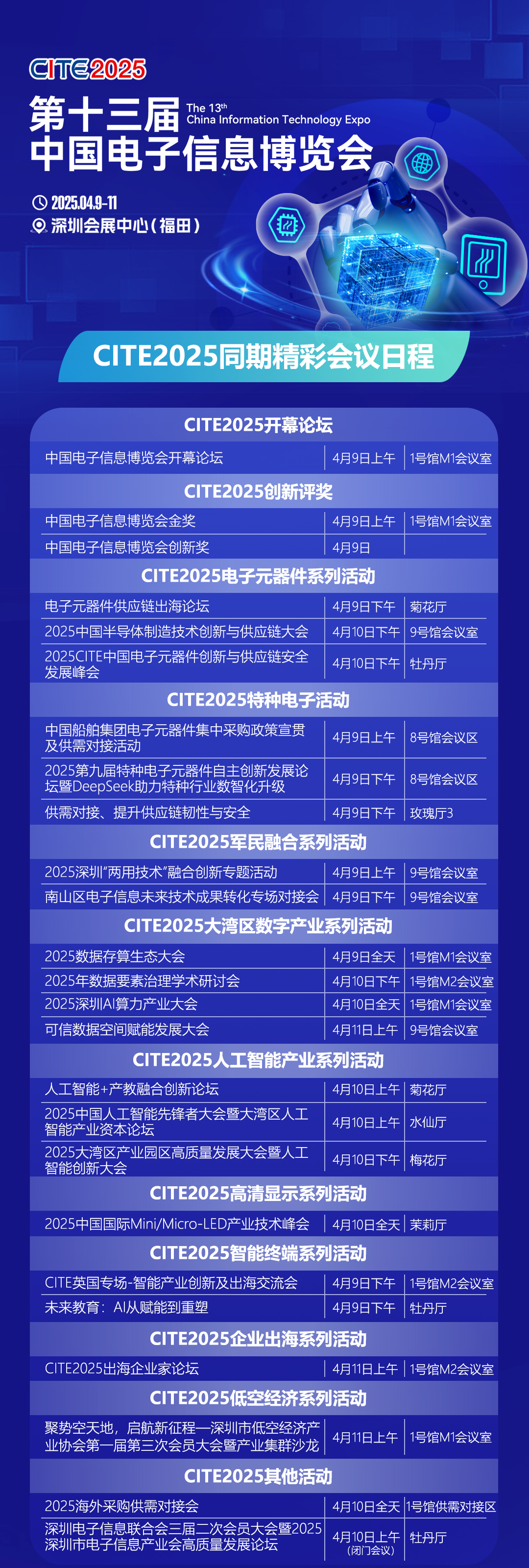 2025年4月9-11日,第十三届中国电子信息博览会(CITE2025)将在深圳会展中心(福田)举办,作为电子信息技术发展的风向标,诚邀您共同开启这场未来科技的探索之旅。