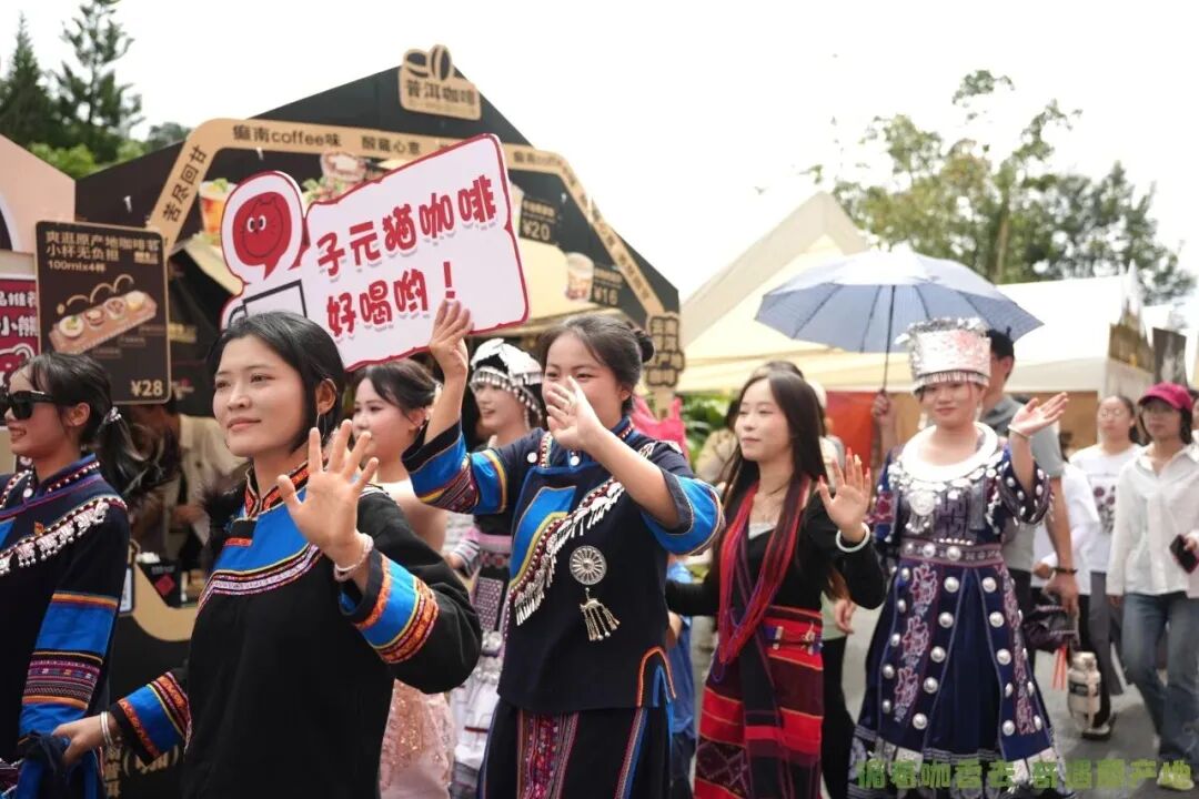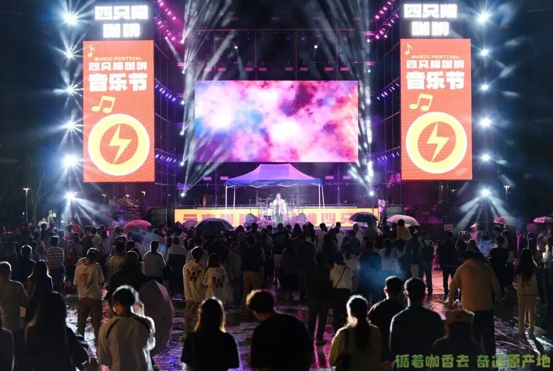 活动以咖啡为主题,融合文化、旅游、美食与音乐元素,打造沉浸式消费场景。白天,游客可以加入民族巡游与打跳互动;夜晚,则有“四只猫云南高山咖啡音乐节”接棒登场,以每日不重样的主题与歌曲,持续点燃消费热情。