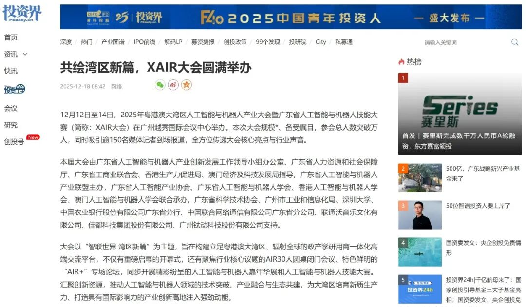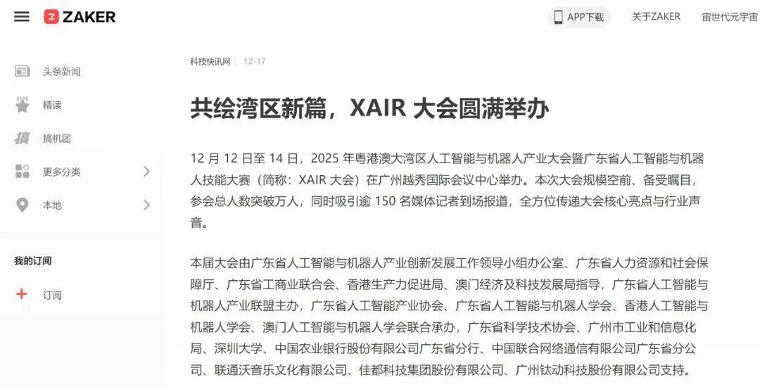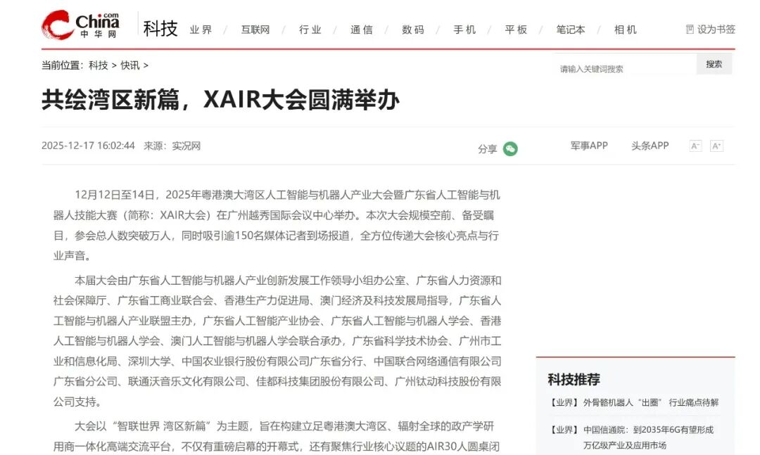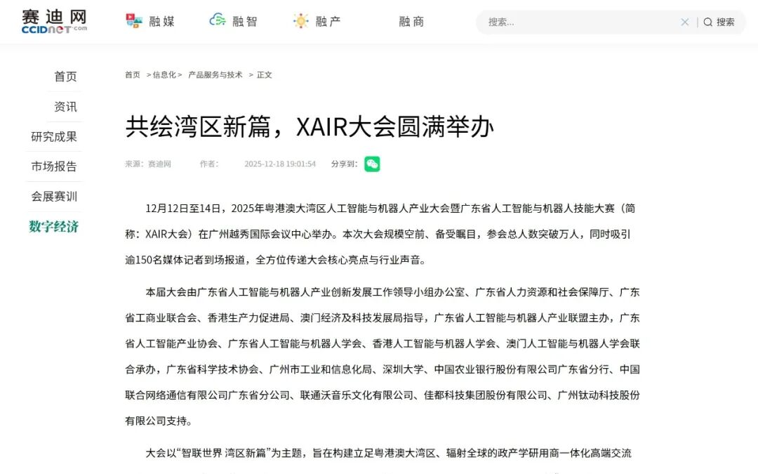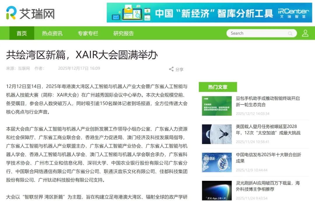 2025年粤港澳大湾区人工智能与机器人产业大会暨广东省人工智能与机器人技能大赛(以下简称“XAIR活动”)于12月12日至14日在广州成功举办。本届活动为期三天,共吸引超1.6万人次到场,现场氛围热烈,产业联动效应显著,为粤港澳大湾区人工智能与机器人产业高质量发展注入了强劲动力。