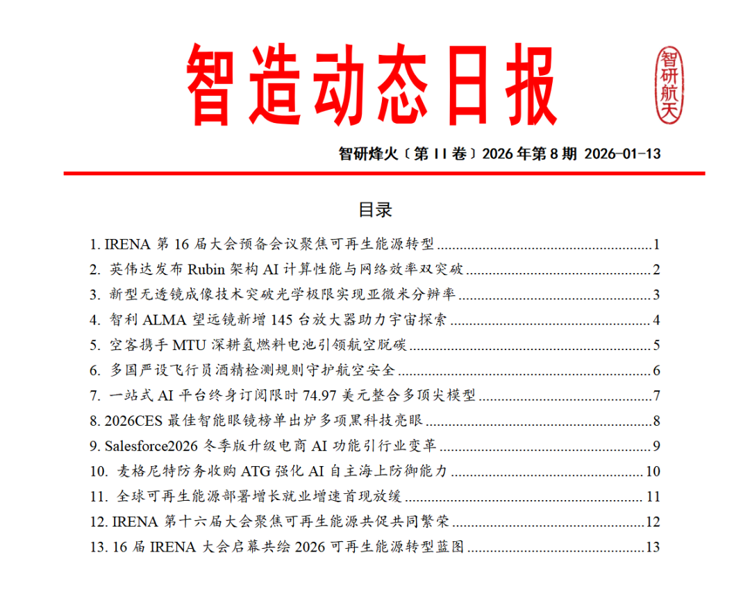 聚焦全球智能制造领域的权威情报产品,每日精选航空技术与应用、人工智能、工业机器人、增材制造、芯片工艺等核心技术突破与产业动态,以结构化、可编辑的文档形式呈现。内容涵盖技术解析、企业战略及政策影响,依托资深专家团队及强大的开源情报处理能力,助力企业快速捕捉技术趋势与市场机遇,把握智造脉搏,引领产业升级。