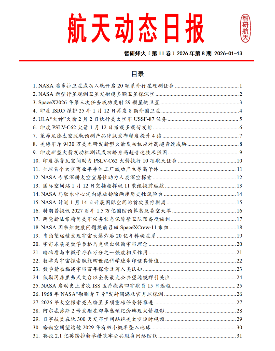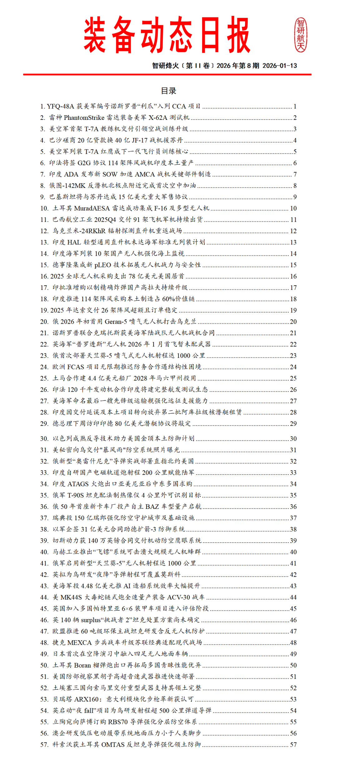 《全球防务动态》系列专刊国内独家每日发布涵盖航天领域、武器装备、军事热点、人工智能、先进制造等领域的全球动态信息。提供“航天动态专报”、“装备动态专报”、“军事动态专报”、“智造动态专报”以及“航天防务新闻日报”等特色产品模块。工作日每日推送,形成结构化、可编辑的文档,供订阅用户在小程序“智研烽火信息”商城下载。每日及时的动态信息能够有力支持各单位进行要讯报送、军情研究与安全形势分析的需求。