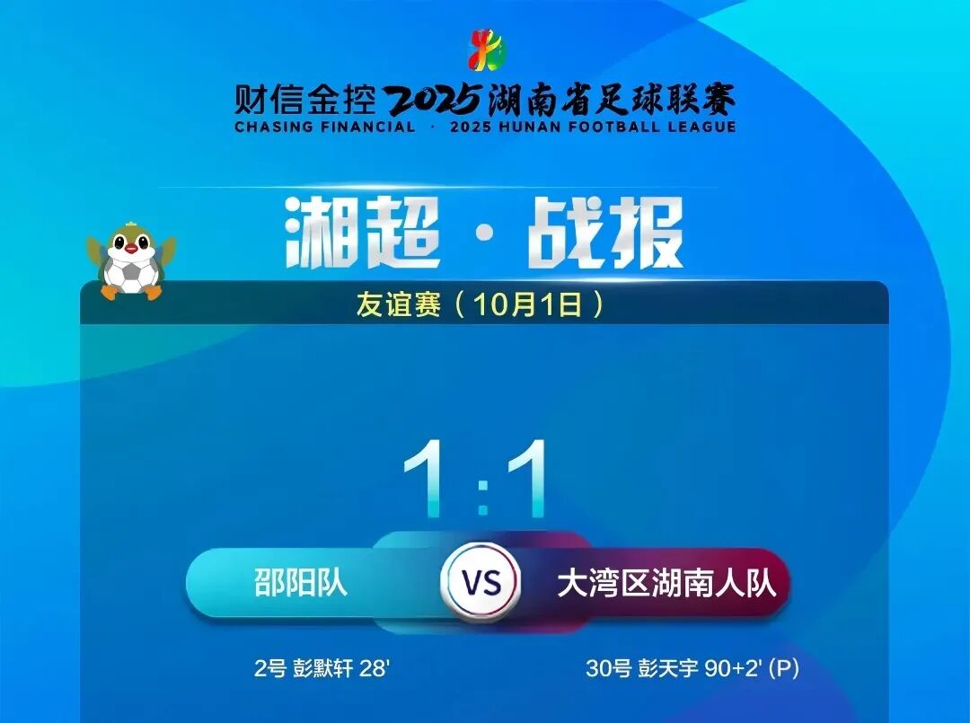 10月1日晚,邵阳市体育中心体育场灯火通明,“湘超”邵阳队:大湾区队上演了一场“湘情德比”,经过90分钟的激烈角逐,最终双方1比1战平。