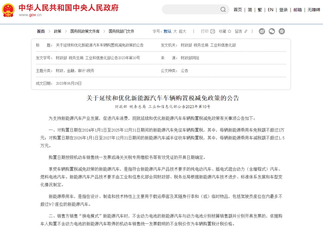 2025年是中国对新能源汽车免征车辆购置税的最后一年。目前车辆购置税税率为10%。对购置日期在2024年1月1日至2025年12月31日期间的新能源汽车免征车辆购置税,其中,每辆新能源乘用车免税额不超过3万元;对购置日期在2026年1月1日至2027年12月31日期间的新能源汽车减半征收车辆购置税,其中,每辆新能源乘用车减税额不超过1.5万元。