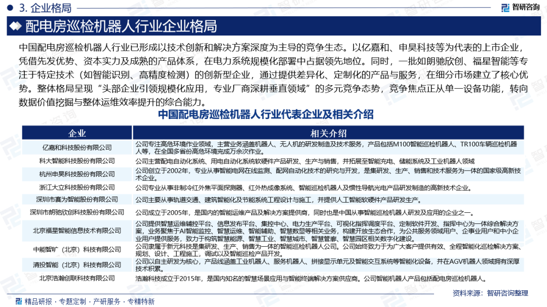配电房巡检机器人是指能够代替或协助人工完成室内配电房设备的巡检工作的机器人。室内配电房是指在建筑物内部设置的供应建筑物用电力的配电设施,通常包括配电变压器、配电柜、计量柜、低压配电盘等。配电房巡检机器人主要应用于10kV及以下的配电房,可对配电房内的设备进行红外测温、表计读数、开关状态识别、异常报警等功能,并提供巡检数据的实时上传和数据分析、信息显示和报表自动生成等后台功能,是智能配电网运维技术发展的重点方向之一。根据巡检方式的不同,配电房巡检机器人可分为轨道式和自由式两种。轨道式巡检机器人是指沿着固定的轨道行走的巡检机器人,通常安装在配电柜的顶部或侧面,通过导轨连接各个配电柜,实现对配电柜内部的巡检。自由式巡检机器人是指能够自由移动的巡检机器人,通常采用轮式或足式行走方式,通过地面导航或视觉导航等技术,实现对配电房内各个区域的巡检。配电房作为供电系统的关键节点,其运行状态直接关系到区域供电的可靠与安全。传统人工巡检方式因配电房数量庞大、分布广泛,且内部环境复杂(空间封闭、电磁干扰较强),长期面临效率低下、安全风险高、易出现漏检错检等问题。在此背景下,配电房巡检机器人成为实现配电自动化和智能化运维的重要工具,凭借其能够有效降低成本、提升巡检效率、显著保障作业安全等优势,展现出广阔的市场需求前景。近年来,得益于国家智能电网战略的持续深入、电力自动化与机器人关键技术的加速融合,我国配电房巡检机器人行业快速发展。数据显示,中国配电房巡检机器人行业市场规模为4.21亿元,同比增长15.33%。未来,随着智能电网建设的全面推进与人工智能、物联网等新技术的不断渗透应用,配电房巡检机器人将朝着更高水平的智能化、网络化方向演进,从而为配电网运维创造更大价值。中国配电房巡检机器人行业已形成以技术创新和解决方案深度为主导的竞争生态。以亿嘉和、申昊科技等为代表的上市企业,凭借先发优势、资本实力及成熟的产品体系,在电力系统规模化部署中占据领先地位。同时,一批如朗驰欣创、福星智能等专注于特定技术(如智能识别、高精度检测)的创新型企业,通过提供差异化、定制化的产品与服务,在细分市场建立了核心优势。整体格局呈现“头部企业引领规模化应用,专业厂商深耕垂直领域”的多元竞争态势,竞争焦点正从单一设备功能,转向数据价值挖掘与整体运维效率提升的综合能力。