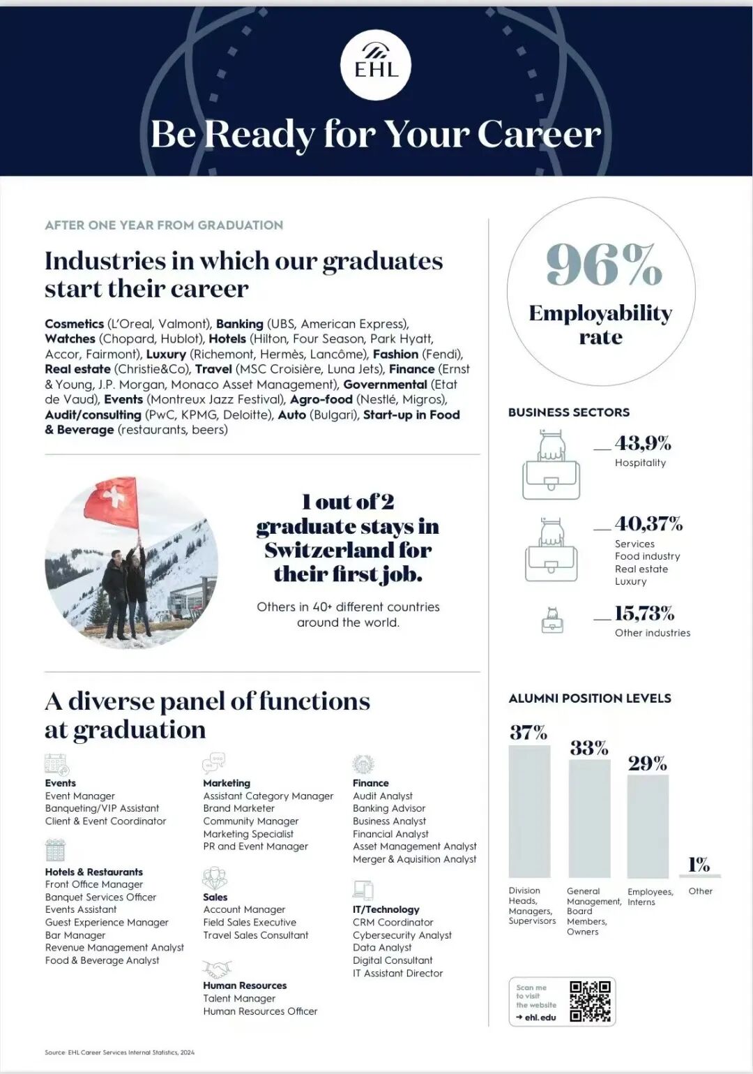 2025年2月最新的就业数据,EHL有一半毕业生选择第一份工作在瑞士。EHL本科项目除了一年带薪实习,大四的学生商务项目、大一的各种实践课,甚至本科的每门课程也都尽量做到结合真实案例,学以致用!