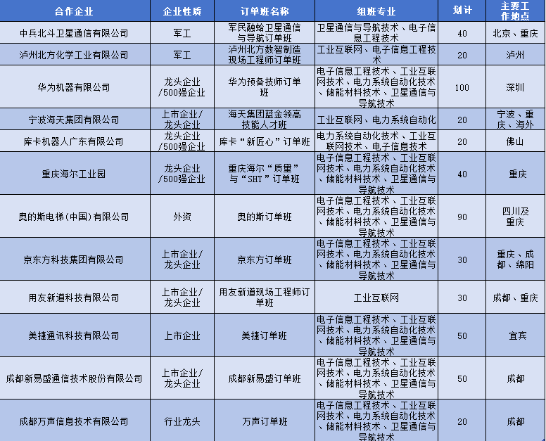 学院与中国兵器工业集团、华为机器有限公司、中国电子科技集团第十研究所、泸州北方化学工业有限公司、重庆航天机电设计院、海尔集团、海康威视、海天精工、京东方科技集团、奥的斯电梯、四川能投等50余家行业龙头企业开展紧密校企合作,其人才培养成效先后获得新道科技、奥的斯等合作企业的“校企合作金成果奖”、“产教融合创新实践奖”等荣誉,学生高端就业率达70%以上(上市公司、龙头企业、国企、外资企业、入伍、专升本等)。
