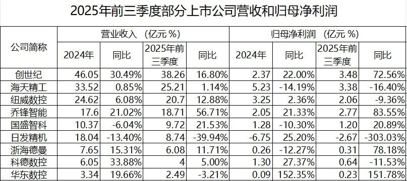 2025年1-9月,规模以上工业企业营业收入同比增长2.4%、利润同比增长3.2%,为2024年8月以来各月累计最高增速;其中,规模以上装备制造业利润同比增长9.4%,高于全部规模以上工业平均水平6.2个百分点。2.2025年机床工具专业19个项目获得“机械工业科学技术奖”根据机床工具工业协会报道,经机械工业科学技术奖机床工具专业评审组评审以及机械工业科学技术奖评审委员会审核批准,申报单位确认,确定19个机床工具专业项目获得2025年度“机械工业科学技术奖”,其中一等奖2项、二等奖8项、三等奖9项。据MIR DATABANK数据统计,2025年三季度中国金属切削机床市场整体呈现回暖,整体市场规模约165.3亿元,同比增长6.4%;2025年前三季度。创世纪、海天精工、纽威数控、乔锋智能等大部分厂商业绩均实现增长。其中,乔锋智能、国盛智科两家企业增长最快,分别同比增长56.71%和21.53%;创世纪以38.26亿元的营业收入,仍稳居行业首位。4.上半年机床上市公司营收恢复增长,利润仍处于下降区间根据机床工具工业协会报道,2025上半年,机床工具行业上市公司实现营业收入651.3亿元,同比增长5.7%,其中37家同比增长,占63.8%。实现利润总额37.0亿元,同比下降35.1%,其中26家同比增长,占44.8%。行业上市公司利润率为5.7%,同比下降3.6个百分点。