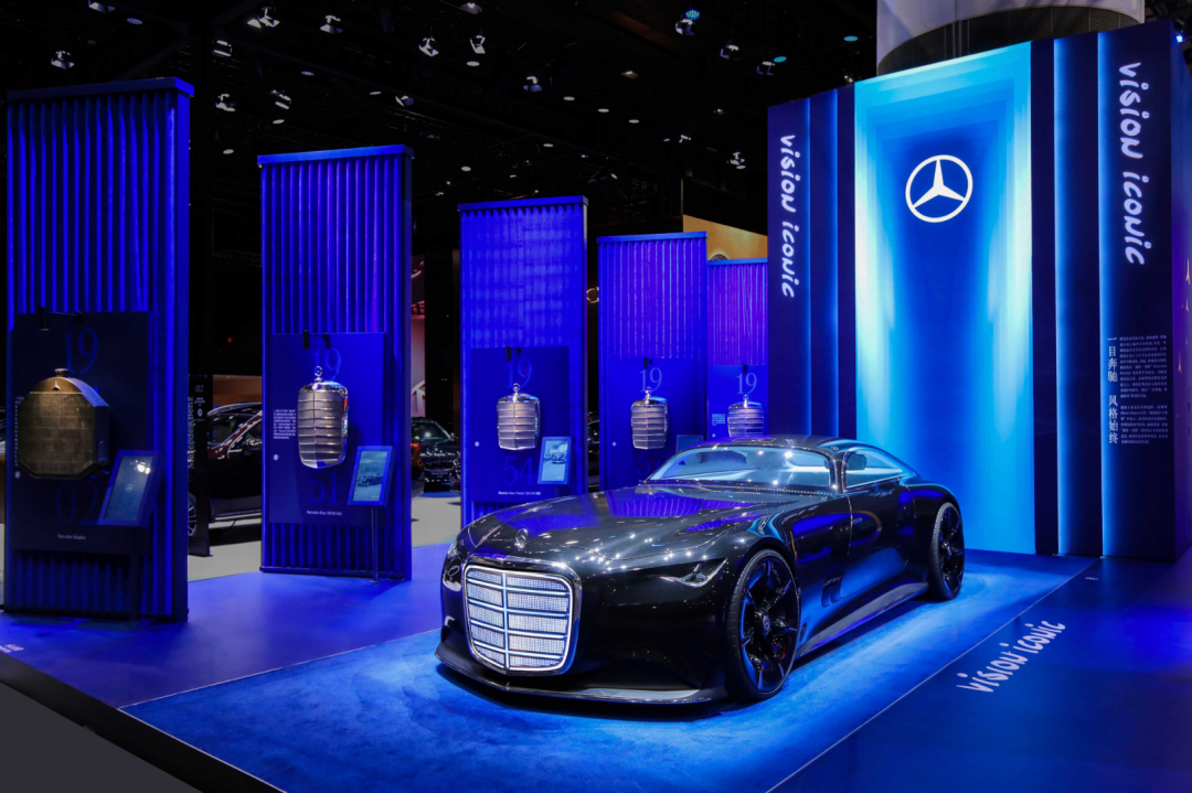今年 10 月完成全球首秀的梅赛德斯 - 奔驰 Vision Iconic 概念车登陆本次车展,该车秉承“一目奔驰,风格始终”(A Mercedes-Benz must always look like a Mercedes-Benz)的品牌设计精髓,在传承品牌设计美学的基础上实现创新突破,重塑汽车历史上最具辨识度的设计元素——梅赛德斯 - 奔驰标志性格栅。全新盾形格栅灵感源自梅赛德斯 - 奔驰 600 Pullman 及 W108、W111 等不同时代经典 S 级的盾形竖直格栅造型,配备宽大镀铬框架、熏黑玻璃质感网格与一体化轮廓照明系统,通过经典复古元素与现代数字科技的有机融合,铸就极具辨识度的奔驰专属“面孔”。瞩目的引擎盖设计、流畅的车身线条及致敬 300 SL 的尾部造型等元素,共同塑造一脉相承的奔驰“姿态”;车头熠熠生辉的三叉星徽立标与格栅动画效果交相辉映,以光影语言传递品牌情感表达;极具视觉张力的前大灯与深邃的深黑色高光车漆,进一步强化车辆的强大气场与尊贵风范。