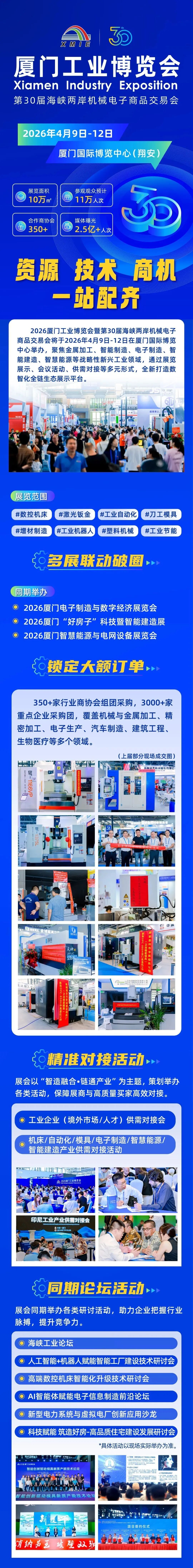 2026厦门工博会将于2026年4月9-12日在厦门国际博览中心举办,同期举办2026厦门电子信息暨专精特新博览会、2026厦门新能源产业博览会、2026厦门智能建造展览会。