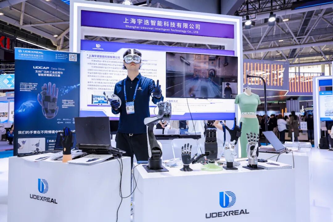 位于上海展团的宇叠科技展区人流如织。我们重点展示的 “面向虚拟交互的智能数据手套” 及 “与机器人企业合作的遥操作解决方案”,成为现场备受瞩目的“技术明星”。