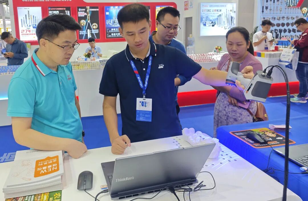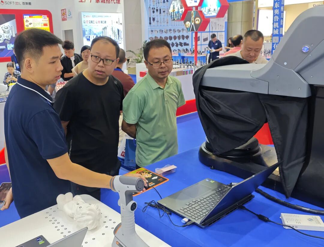 (现场工作人员向客户介绍三维扫描测量仪)