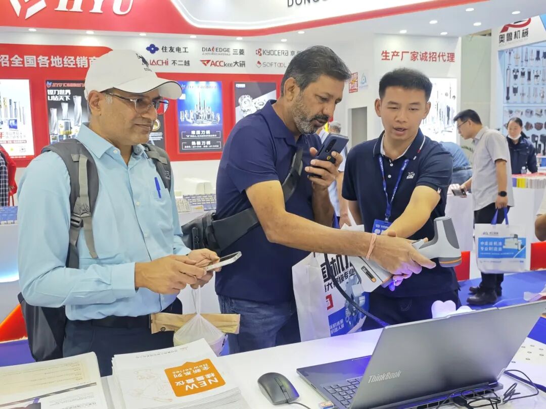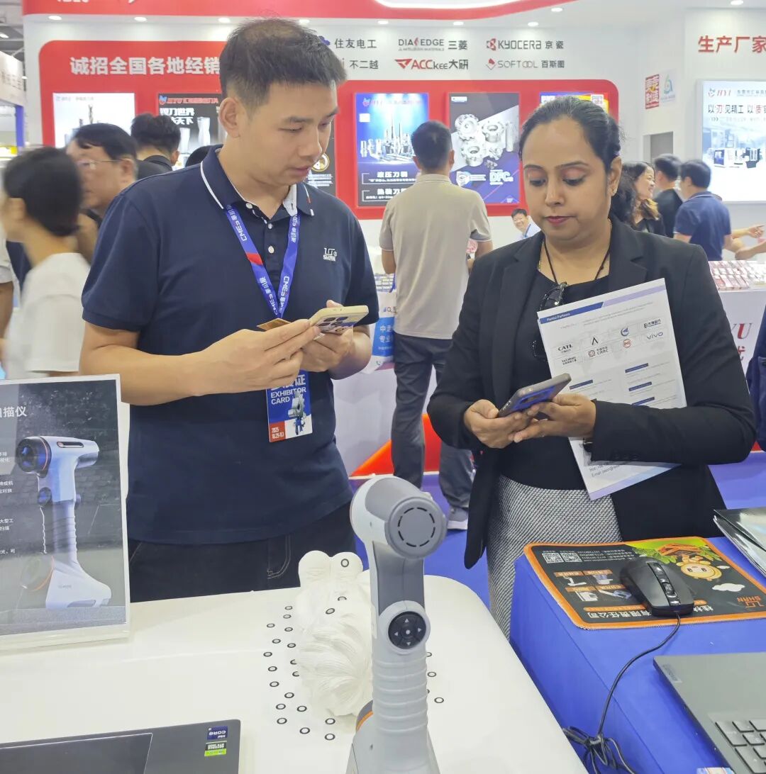 手持激光扫描仪凭借其高精度、便捷性,成为现场焦点。我们的团队在向外国友人演示手持激光扫描仪时,他们纷纷拿出手机记录并亲自上手体验,随后他们就产品的技术原理与应用方案与我们的团队进行了详尽交流,并对其卓越性能给予了高度评价。