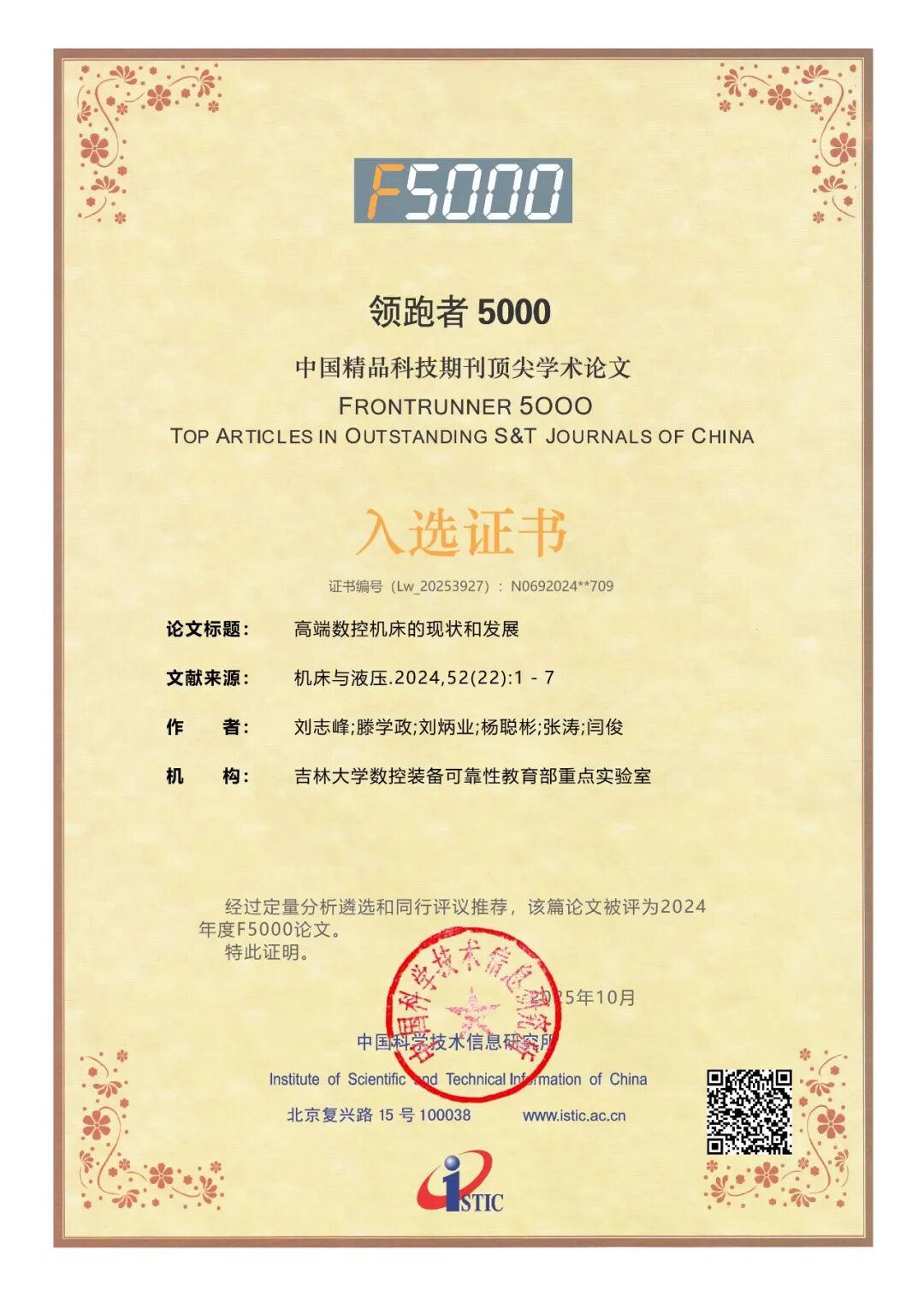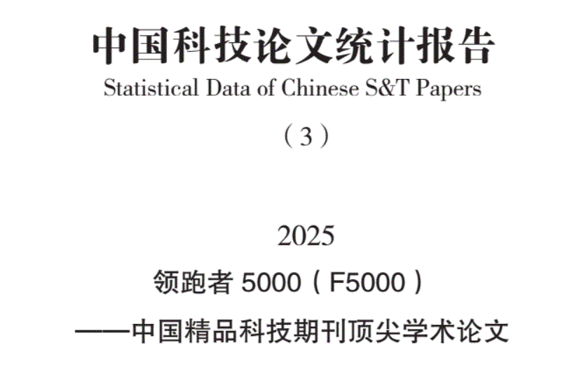 近日,中国科学技术信息研究所正式发布2025年度“领跑者5000——中国精品科技期刊顶尖学术论文(F5000)”入选名单。该评选旨在从中国精品科技期刊中遴选各学科前1%的高被引顶尖学术论文,推动中国优秀科研成果的国际传播。