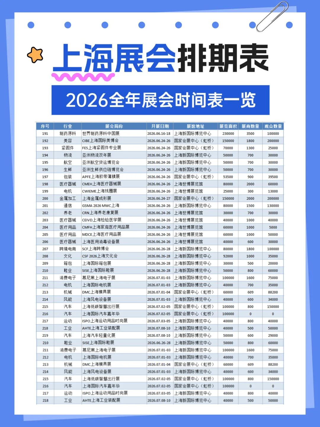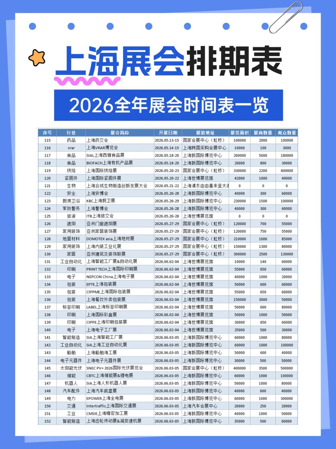 2026年上海将举办多场各行业展会,涵盖了百货、婚嫁、珠宝、袜业、帽子、家居、粉体加工、电机、运动、钓具、旅游、餐饮、家具、酒店用品、清洁用品、环保、物流、医药、美容、校服园服、纺织、服装、食品、烘焙、电子、水处理、管材、泵阀、环保、食品配料、保健、汽车、金属加工、铝工业、孕婴童、礼品、百货、燕窝、渔业、医疗器械、五金、教育、品牌授权、玩具、口腔、动力传动、物流、压缩机、包装、食材、自有品牌、新材料等行业,小编已为大家整理好关于2026上海全年展会(最新版)请查收,助你高效逛展。关注【展会全地图】公众号,发送【上海】