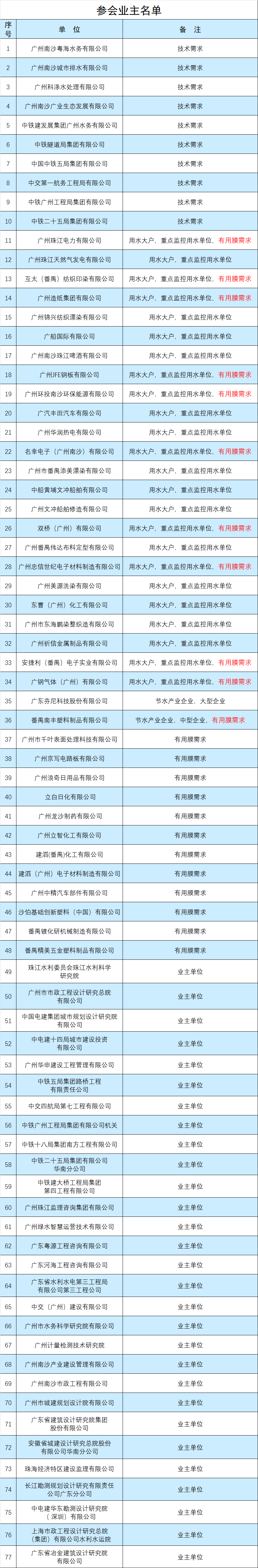 ❖ 政企研阵容鼎盛 大量需求场景发布:研讨会依托“2026大湾区节水工业发展与科技创新大会”,获相关政府部门大力支持,政策精准传导,大量需求场景现场发布,邀约化工领域重点用水企业参会,粤海水务、中电建十四局、中铁五局等头部业主单位、施工企业,以及环保技术龙头企业、科研院所齐聚,精准匹配供需、资源高效对接。更有“世界水周”同期举行,双会联动、协同造势。(参会业主名单详见下文)