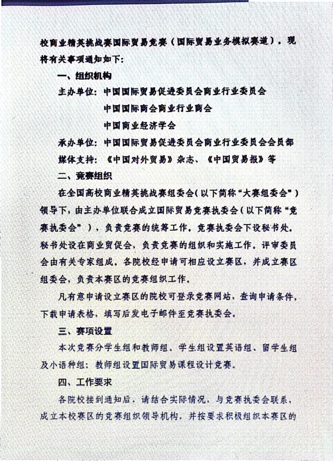 全国高校商业精英挑战赛国际贸易竞赛是由中国国际贸易促进委员会商业行业委员会(以下简称“商业贸促会”)牵头主办的学科竞赛活动。经过多年的培育,全国高校商业精英挑战赛国际贸易竞赛业已发展成为我国国际经贸教育领域,基于校企合作的规模较大的综合实践平台和学科竞赛活动。