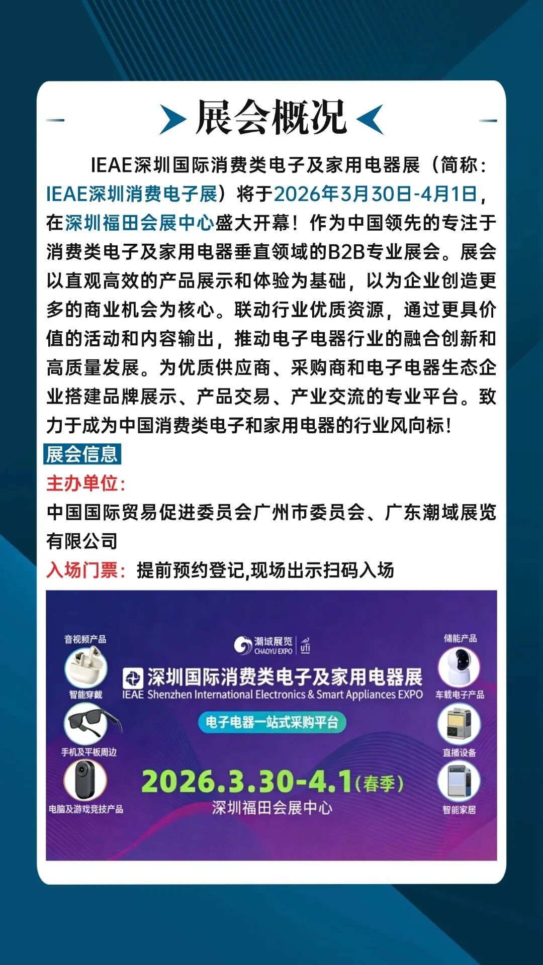 2026IEAE深圳国际消费类电子及家用电器展(简称:2026IEAE深圳消费电子展)作为中国领先的专注于消费类电子及家用电器垂直领域的B2B专业展会。