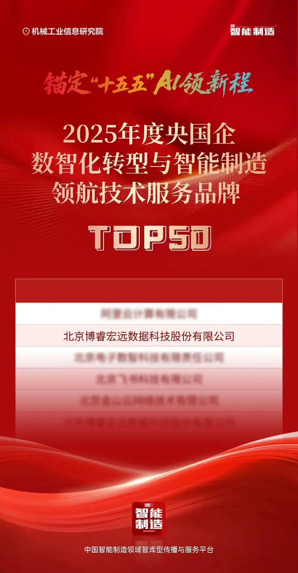 此次“2025央国企数智化转型与智能制造领航技术服务品牌TOP50”评选,旨在挖掘表彰为央国企数智化转型与智能制造提供卓越服务的技术品牌,树立行业创新典范。评选标准涵盖技术实力与产品能力、项目实施案例、服务能力与客户口碑、行业示范性四大维度,重点考察企业在核心技术先进性、央国企项目经验与成效、专业服务能力以及解决方案的可复制性等方面的综合实力。博睿数据能够脱颖而出入选TOP50,彰显了其在赋能央国企数智化转型与智能制造领域的卓越贡献与产品实力。