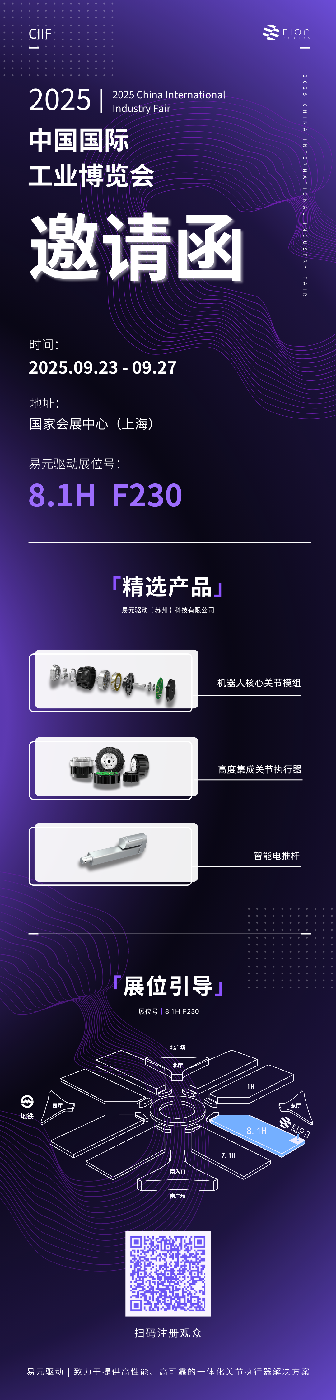 明日起至27日,安易行旗下子公司易元驱动将携机器人核心关节模组、高度集成关节执行器、智能电动推杆等产品亮相第二十五届中国国际工业博览会(简称工博会),诚邀您莅临8.1H机器人展馆F230展台,共享智能科技盛宴!期待与您携手交流!