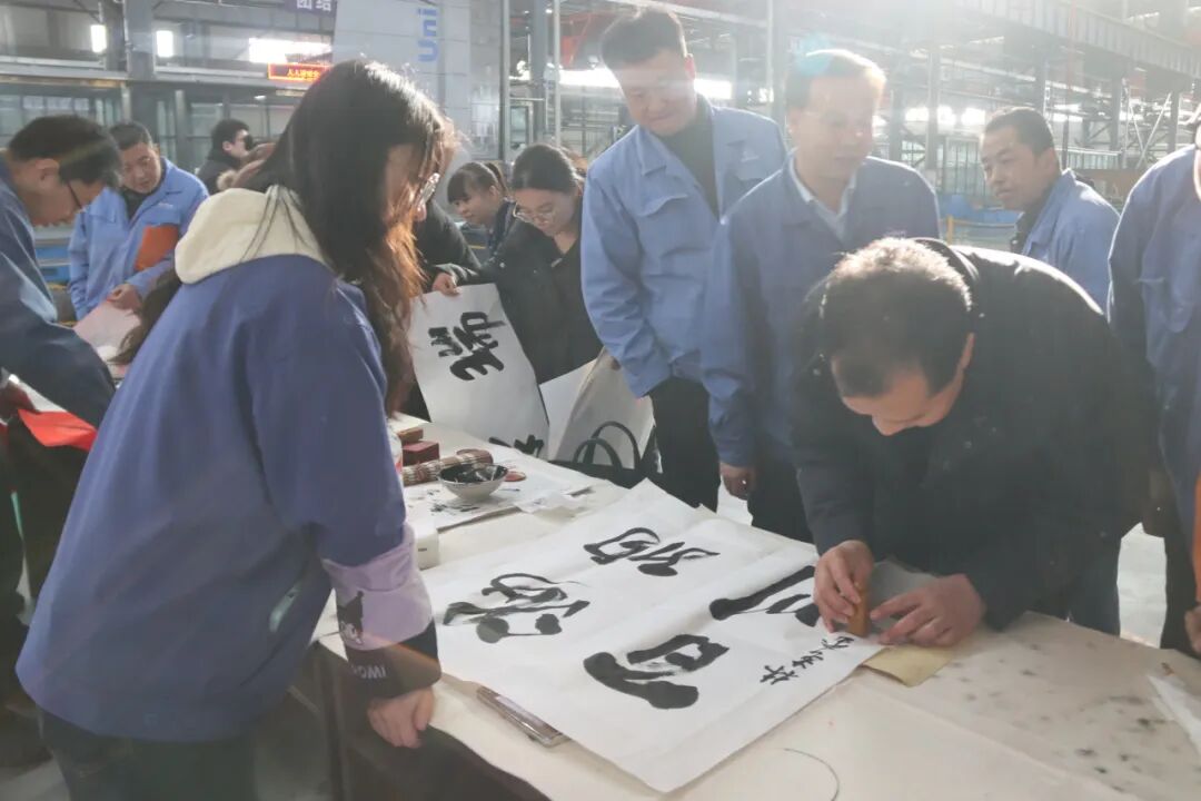 墨香阵阵的年味专区尤为引人注目。市文联、市书法家协会的书法家们现场挥毫泼墨,一幅幅寓意吉祥的春联和“福”字在他们的笔下诞生。“人和家顺福星照、心想事成鸿运开”“匠心铸就强国梦,数控精工时代魂”等结合百姓人家和企业特点的定制春联尤其受到职工欢迎。短短两小时,书法家们书写赠送的百余副春联,赤纸金墨映照着职工们喜悦的笑脸。