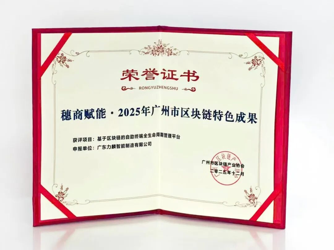 力麒集团旗下核心企业广东力麟智能制造有限公司“基于区块链的自助终端全生命周期管理平台”获评“穗商赋能·2025年广州市区块链特色成果”。此次多项荣誉的获得,是对力麒智能在人工智能与数字化领域持续投入与实践成果的肯定。力麒智能将继续专注技术研发与产品优化,踏实服务好客户与行业伙伴,为大湾区数字经济的务实发展贡献自身力量。