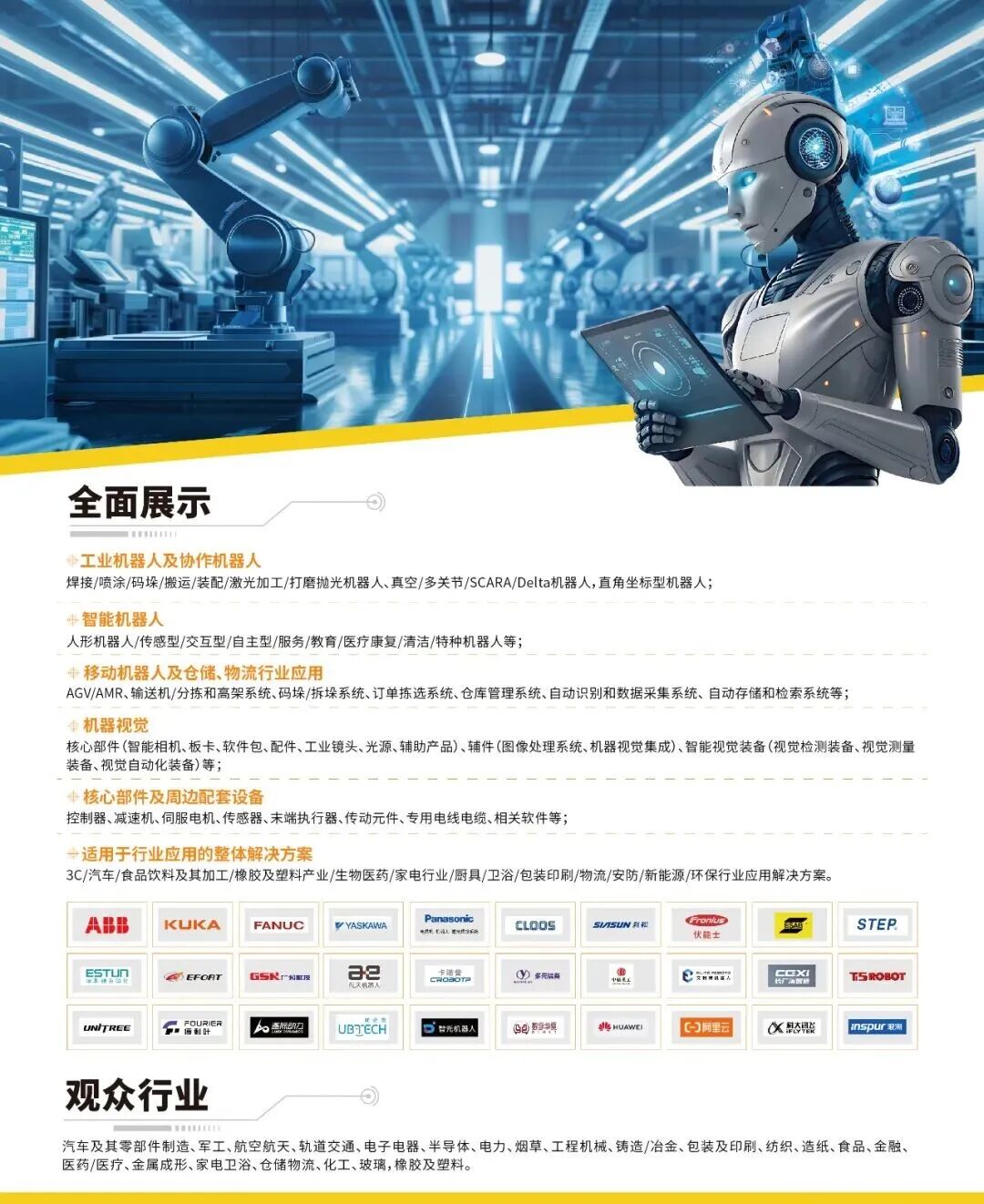 其中,ABB、库卡、发那科、安川、中信重工、西门子、汇川技术、埃夫特、埃斯顿、广数、艾利特机器人、天空航天、赛博格机器人、克鲁斯、多元智能、长广溪、宇树科技、优必选、钛虎机器人、戴盟机器人、鹿明机器人、众擎机器人等一批行业头部品牌已意向参展,构建出一个堪称“豪华天团”的机器人产业矩阵。