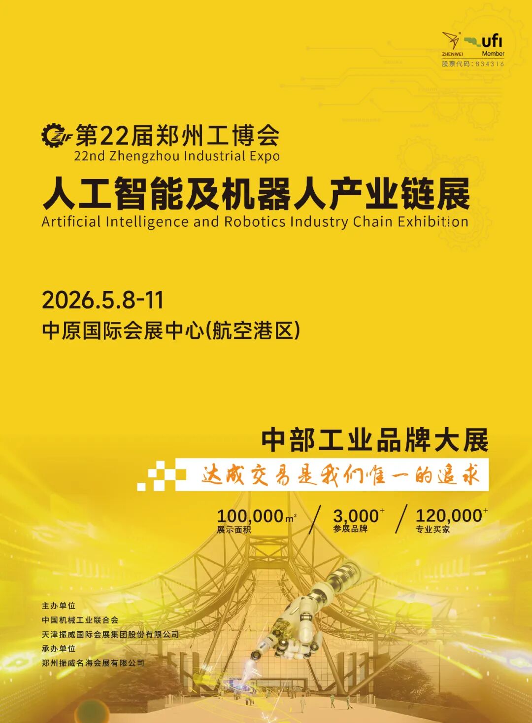 顺应国家战略号召,紧扣产业发展脉搏,2026第22届郑州工博会重磅设立“人工智能及机器人产业链展”,旨在为行业领军企业搭建交流合作、展示成果的高端平台,助力产业翘楚进一步发展壮大,同时也将为现场观众呈现一场科技感拉满、震撼人心的人工智能与机器人科技盛宴。