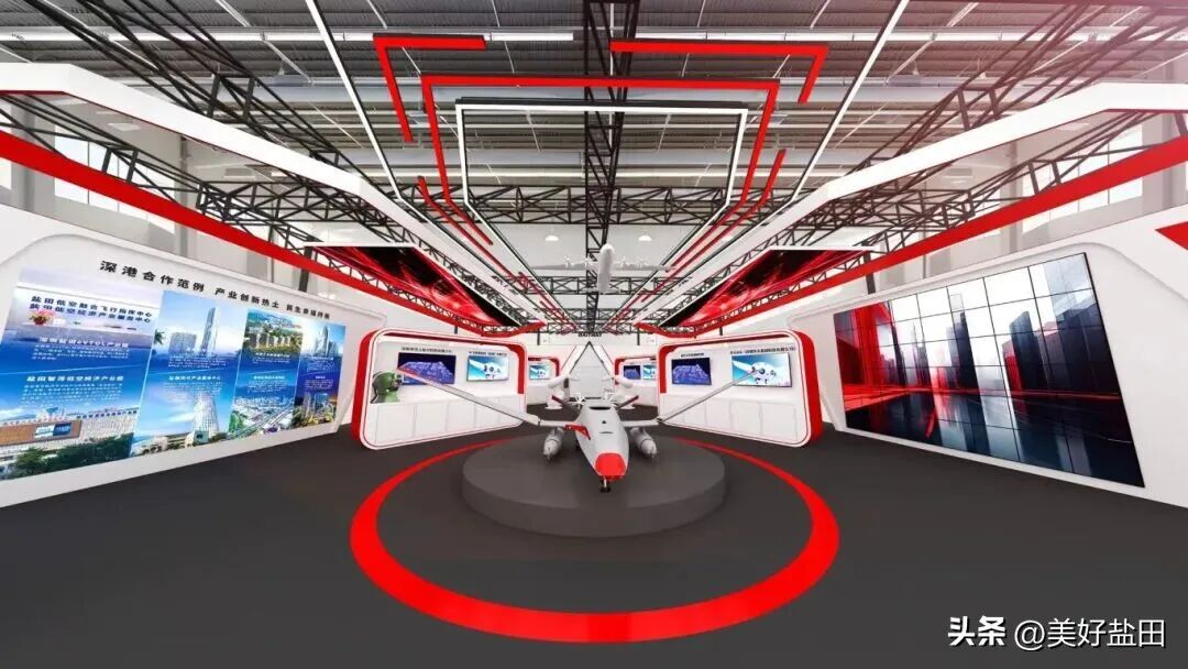 展台采用开放式布局,通过流线型的展架设计和动态的灯光效果,营造出强烈的科技感和未来感。中心区域设置了大型互动展示屏,实时展示坪山区四大产业的发展动态。