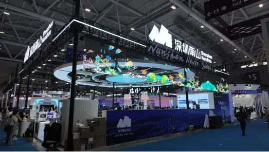 南山区展台在材料使用上追求通透感和轻盈感,大面积使用玻璃、透明亚克力等材料,配合 LED 显示屏和投影技术,营造出梦幻般的视觉效果。弧形吊装屏采用特殊的透明材料制成,在不使用时几乎隐形,保持了空间的开放性