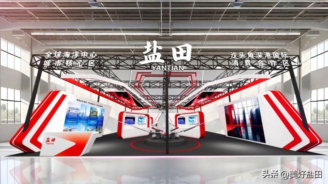 盐田区展台设计灵感来源于 "中华白海豚尾鳍逐浪",以 "新浪潮为核心理念,整体造型融入海豚尾鳍逐浪的意象。红白主色调中,红色如浪花跃动的张力,呼应海豚灵动身姿里的海洋活力;白色似海豚的纯净体态,聚焦科技创新、技术革命与现代海洋生活