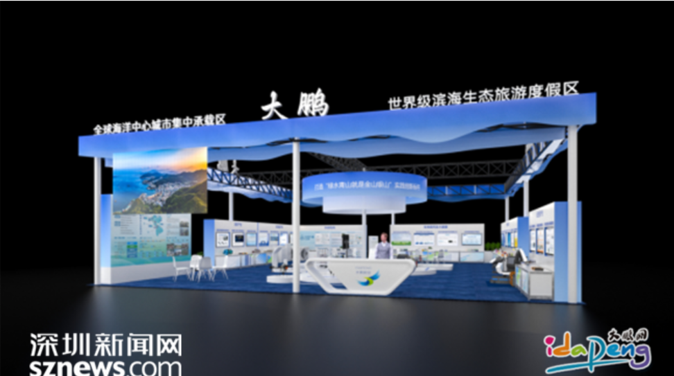 大鹏新区展台在材料使用上特别注重环保性和生态性。展位整体采用环保材料,设计简约、可循环利用、低碳环保、绿色科技。展台整体色调沿用海洋元素的蓝白基底,通透开放的设计布局展示了新区的城区概况、区位优势、发展战略等
