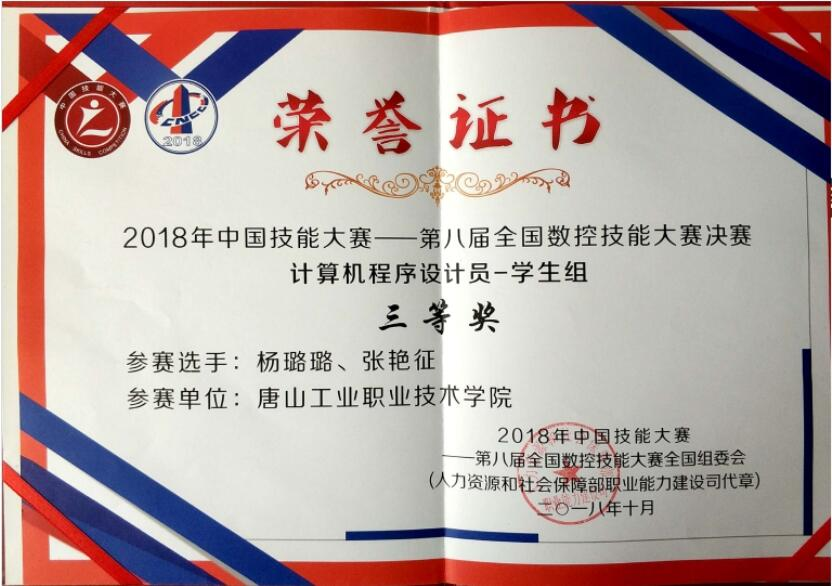 第八届全国数控技能大赛全国总决赛——计算机程序设计员团体三等奖