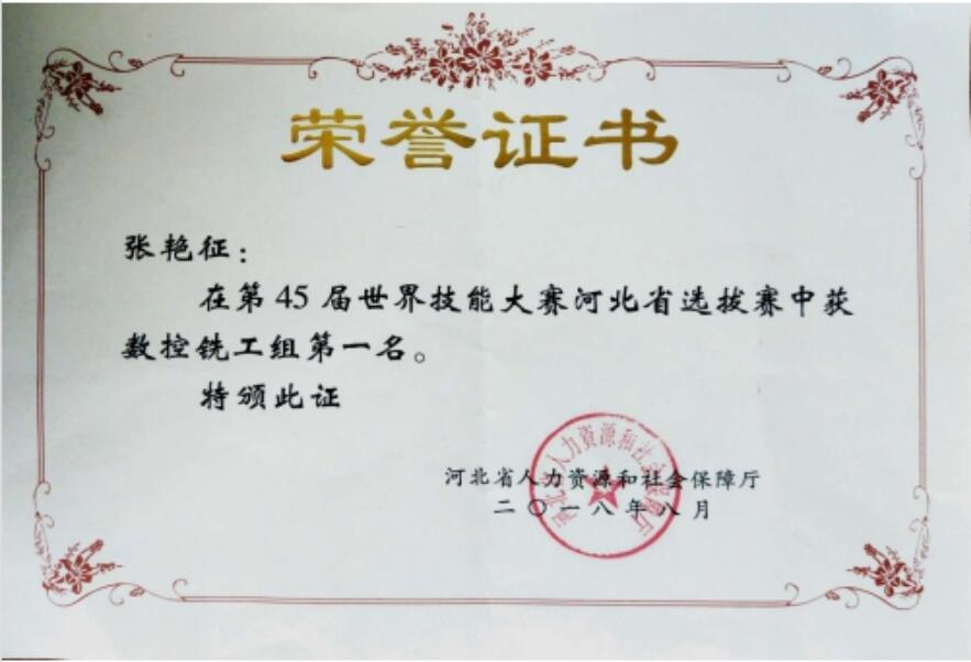 第45届世界技能大赛河北省选拔赛数控铣工第一名