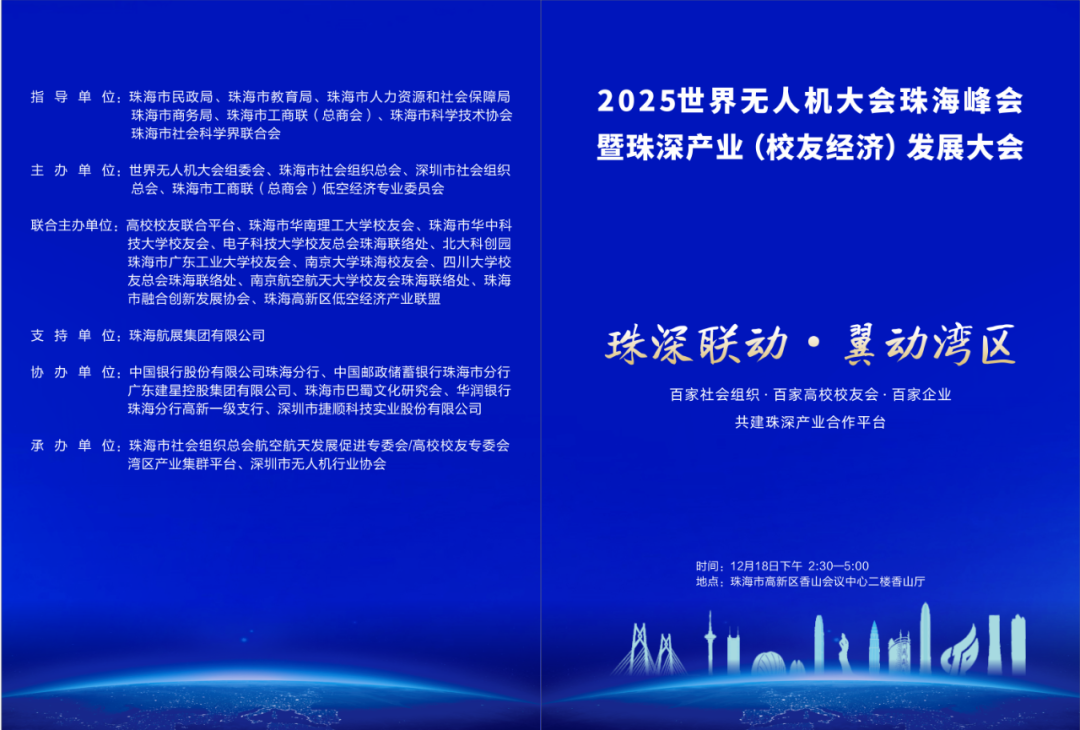 12月18日,2025世界无人机大会珠海峰会暨珠深产业(校友经济)发展大会在珠海高新区香山会议中心隆重举行。大会以“珠深联动,翼动湾区”为主题,来自珠海政府相关职能部门,市工商联,市科协,市社科联以及相关专家学者,珠深两地社会组织、校友会和企业代表逾五百人,共商珠深产业协同与低空经济发展。珠海市巴蜀文化研究会作为本次大会的重要协办单位,同时也是大会“三百”(百家社会组织、百家高校校友会、百家企业)协同发展体系的核心成员之一,充分发挥社会组织桥梁纽带作用,依托自身深厚的巴蜀文化底蕴与广泛的政企资源网络,积极链接川渝籍行业精英、科创人才与珠深产业需求,为大会注入多元协作动能,成为推动“政府指导+社会组织搭台+企业唱戏”机制落地的重要实践载体,为推动珠深低空经济产业协同、赋能大湾区高质量发展贡献了卓越的巴蜀力量。
