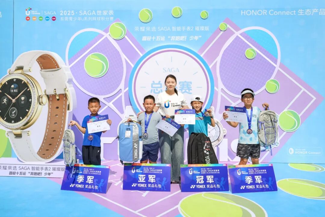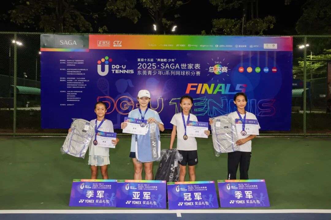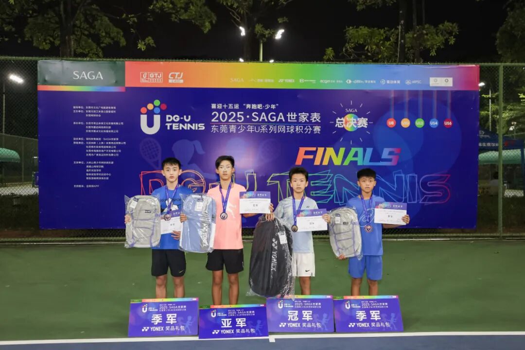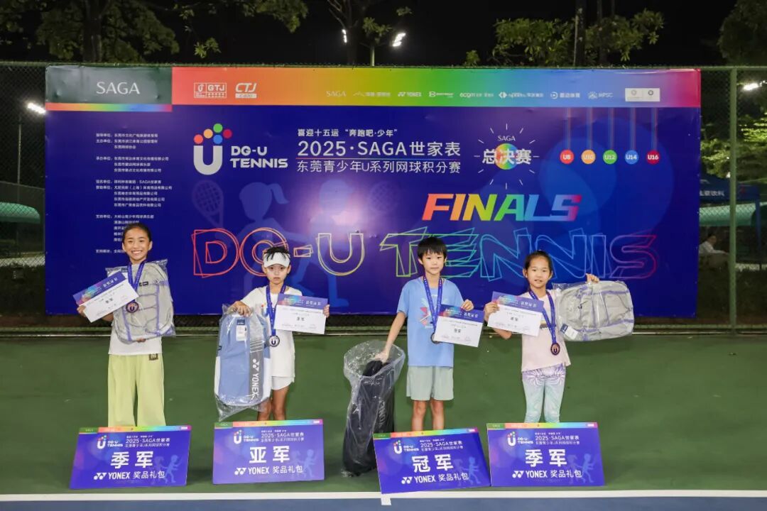 喜迎十五运“奔跑吧·少年”2025“SAGA世家表”东莞青少年U系列网球积分赛总决赛(CTJ-C400)于11月1日在东莞市网球中心成功举办。经过全年四站分站赛的激烈角逐,共有166名选手脱颖而出,获得总决赛参赛资格。经过一天的激烈比拼,最终顺利产生八个项目的冠军。