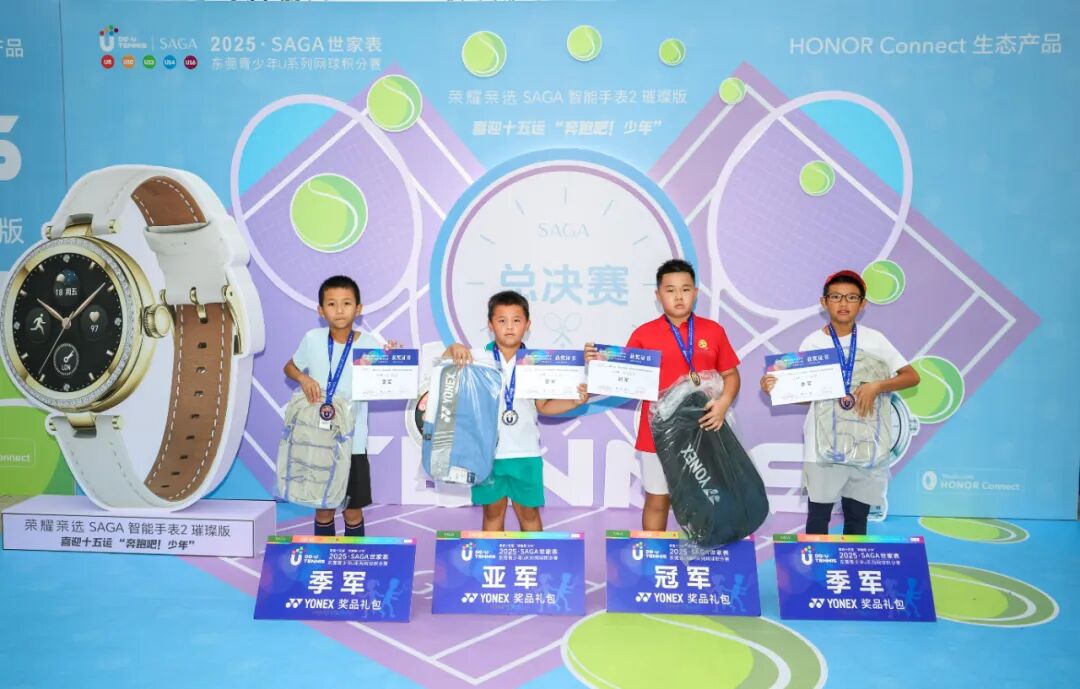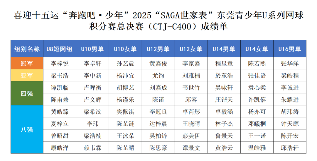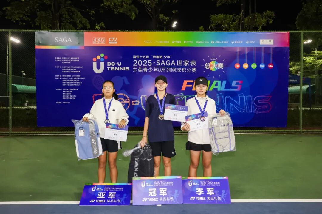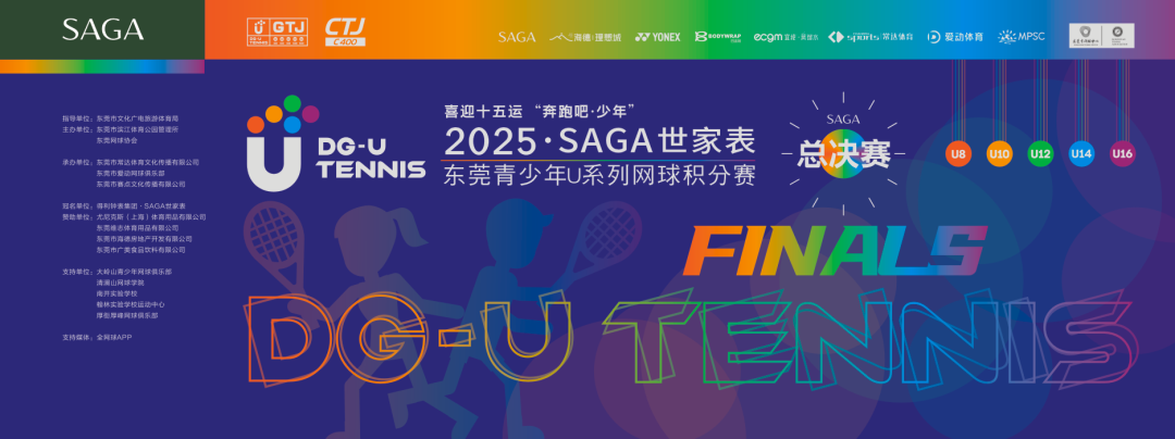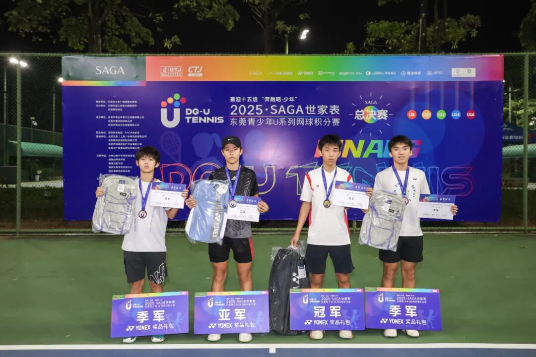 喜迎十五运“奔跑吧·少年”2025“SAGA世家表”东莞青少年U系列网球积分赛总决赛(CTJ-C400)于11月1日在东莞市网球中心成功举办。经过全年四站分站赛的激烈角逐,共有166名选手脱颖而出,获得总决赛参赛资格。经过一天的激烈比拼,最终顺利产生八个项目的冠军。