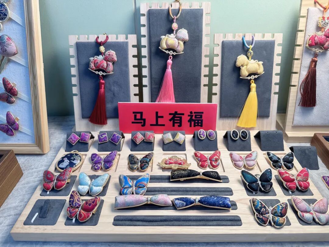 展会期间,来自世界各地的客商纷纷驻足,对南京江北新区残疾人就业创业协会展出的宋锦文创作品表现出浓厚兴趣。展台上,一款专为2026马年设计的“马踏龙云纹”马年挂件成为当之无愧的明星产品。其纹样融合了传统龙马精神与现代审美,寓意“龙马奔腾、事业腾飞”,深受国内外采购商青睐。