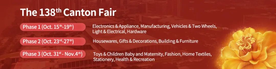 The 138th China Import and Export Fair (Canton Fair) will be held in three phases from October 15th to November 4th, 2025. The exhibition themes and exhibition area Settings for each phase are as follows: