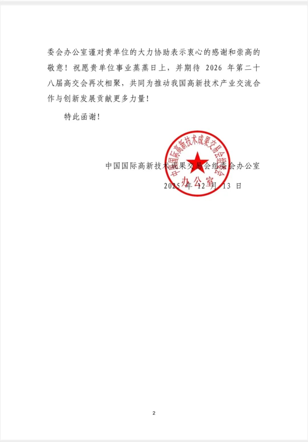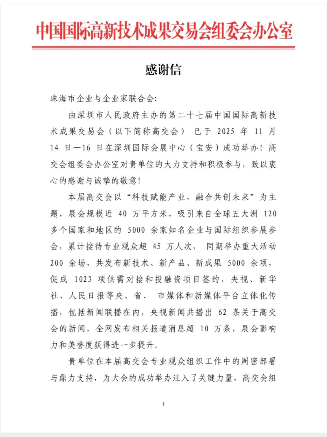 12月23日,我会收到来自深圳市人民政府主办的第27届中国国际高新技术成果交易会组委会办公室的感谢信,对我会在本届高交会专业观众组织工作中的周密部署与鼎力支持和其他相关工作大力协助表示衷心的感谢和崇高的敬意,并期待2026年第28届高交会再次相聚,共同为推动我国高新技术产业交流合作与创新发展贡献更多力量。