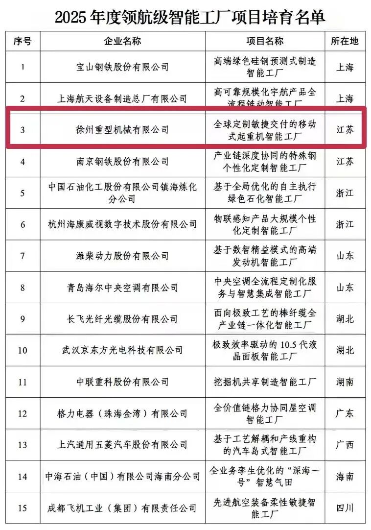 11月27日上午,在2025世界智能制造大会上,工业和信息化部等六部门正式公布了首批领航级智能工厂名单,徐工荣耀入选!首批公布的领航级智能工厂共15家,涵盖装备制造、原材料、电子信息、消费品等多个关键行业。工业和信息化部相关负责人表示,领航级智能工厂,融合了新一代信息技术、先进制造技术、精益管理理念等,代表了我国制造业智能化的最高标准。