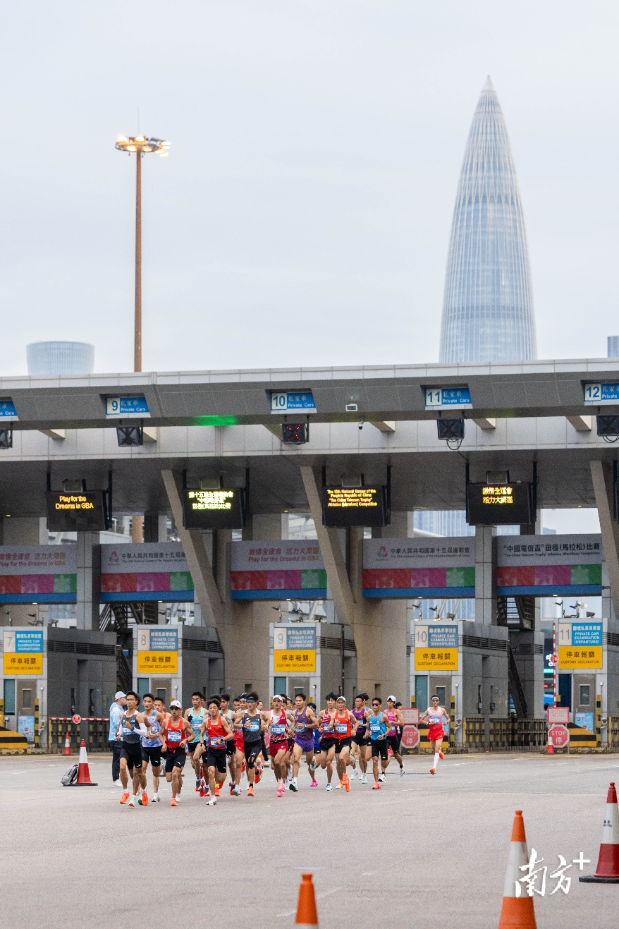 2025年11月15日,十五运会田径(马拉松)比赛开赛。图为马拉松男子选手通过深圳湾口岸,进入香港。