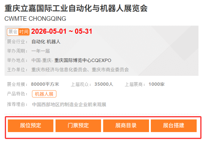 重庆立嘉国际工业自动化与机器人展览会CWMTE CHONGQING【展位预定、门票预定、展商目录、展台搭建、差旅行程、签证、翻译、物流运输、补贴申报】