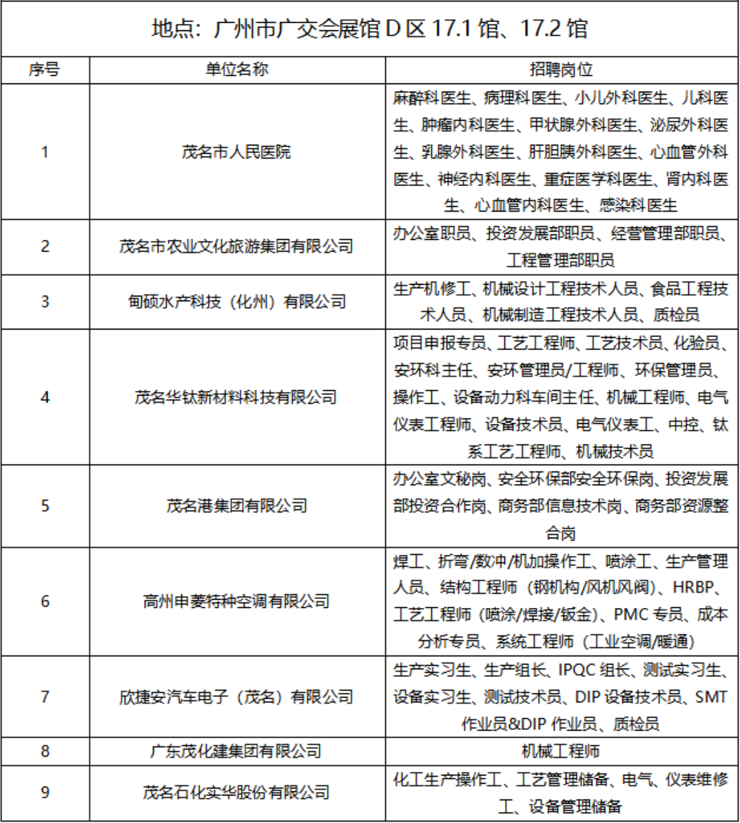 茂名现场参聘单位名单(3月16日)