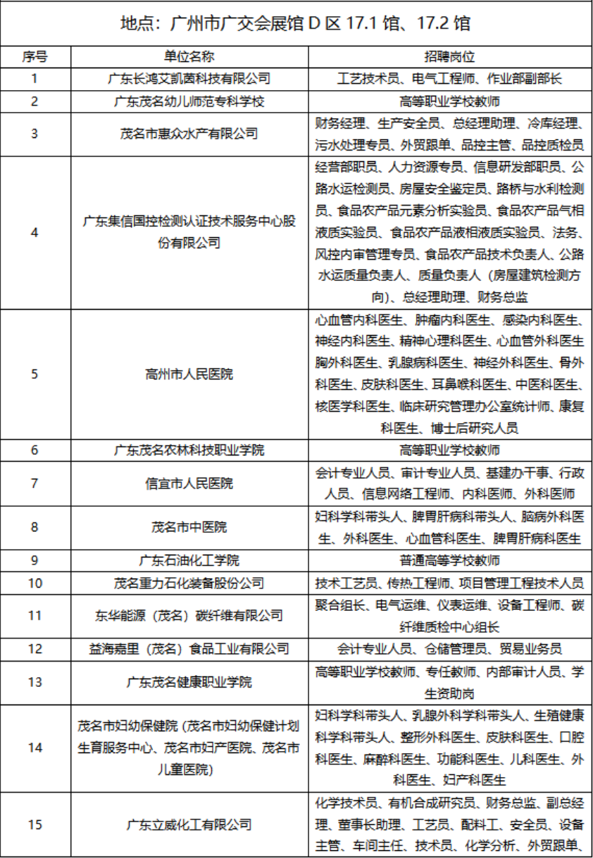 茂名现场参聘单位名单(3月15日)