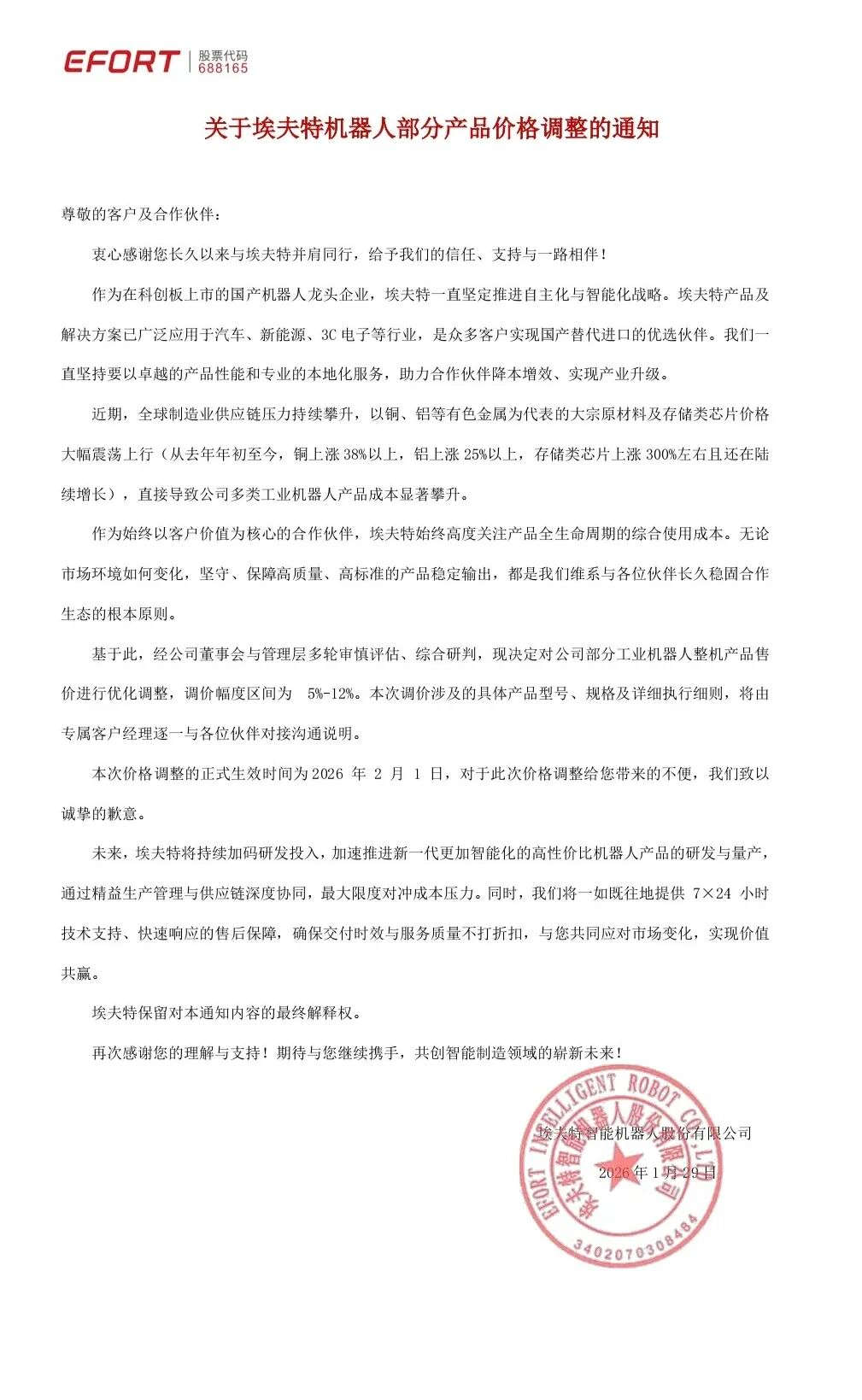 基于此,埃夫特决定对其部分工业机器人整机产品售价进行优化调整,调价幅度区间为5%-12%。本次价格调整的正式生效时间为2026年2月1日。
