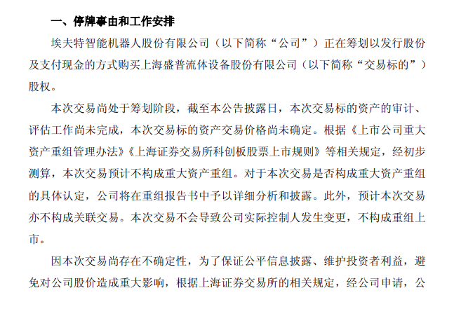 埃夫特发布公告称,正在筹划以发行股份及支付现金的方式购买上海盛普流体设备股份有限公司(以下简称“盛普股份”)股权。