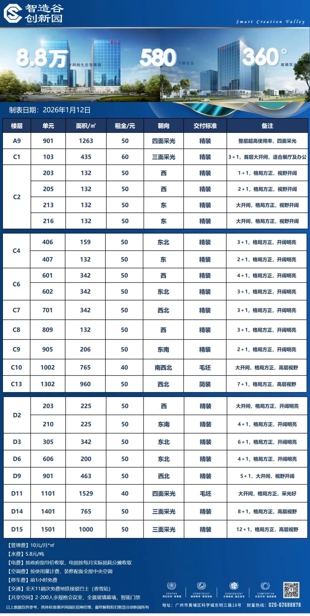 智造谷创新园位于黄埔区科学城,园区总投资超5亿元,总建筑面积约8.8万㎡,目前园区已进驻企业已过百家,涉及物联网与工业互联网、智能安防、软件开发、传感器硬件研发、生物医药等行业。智造谷创新园临近高速出入口,10分钟内进入京港澳高速出入路口和广园快速路,直达广州中心城区和周边城市。坐拥湾区城市圈中心高效交通网络,北接合生中央城,南连广深高速,速达黄埔港,30分钟联通大湾区经济圈,60分钟畅通广佛深。致力打造新一代信息技术、智能智造、生物医药、新能源等科技型中小型产业集聚特色园区,适合企业生产研发及办公等需求。